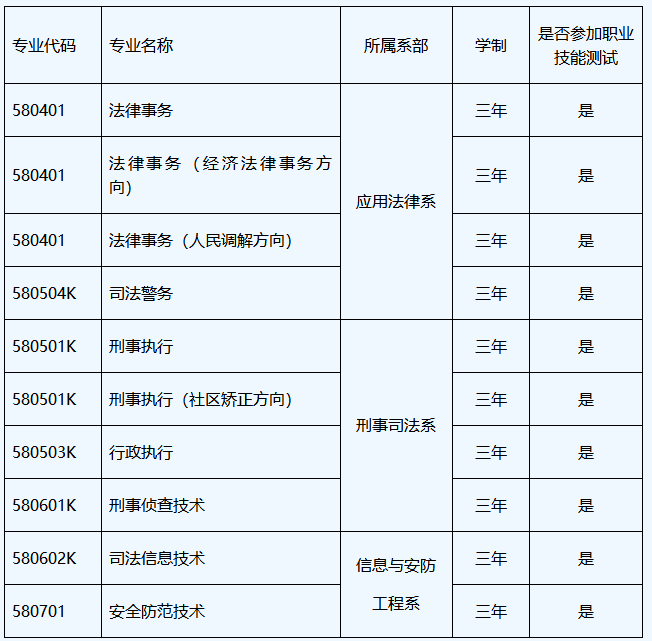 就业面向:法检机关的司法警察岗位、监狱戒毒等机构的警察岗位、看守所的辅警岗位。